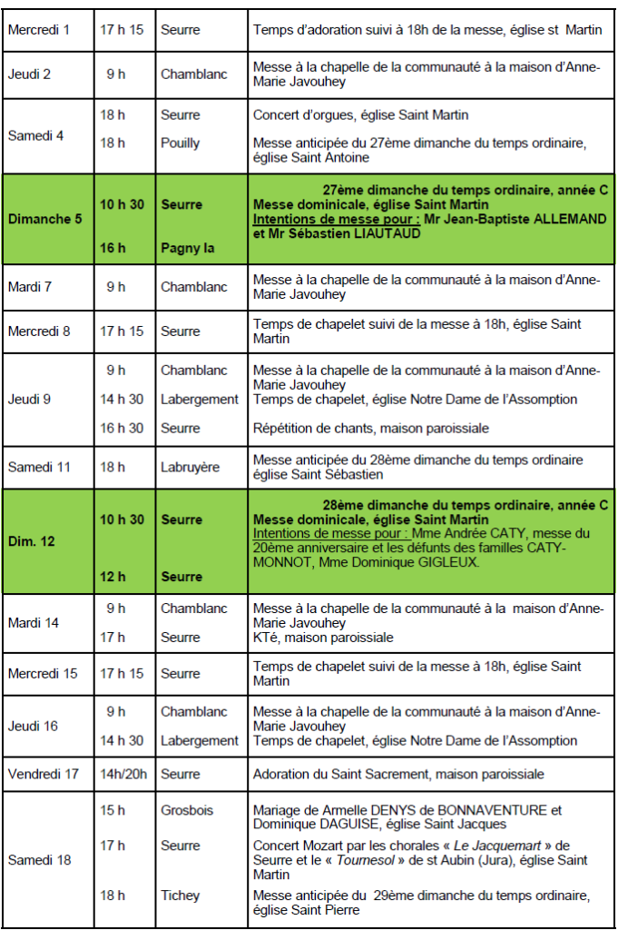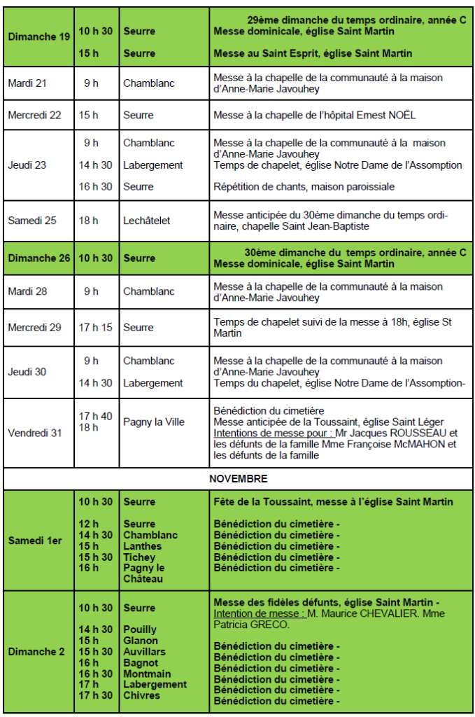 - 1er novembre : Fête de la Toussaint, messe à Seurre et bénédiction des cimetières (Voir programme)